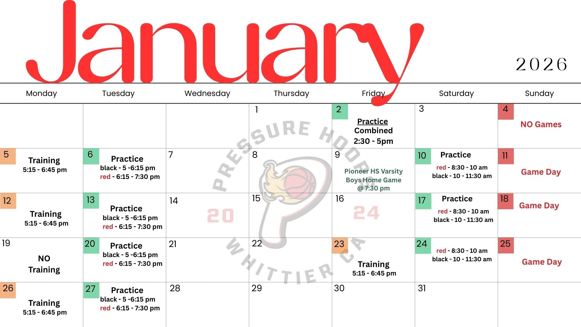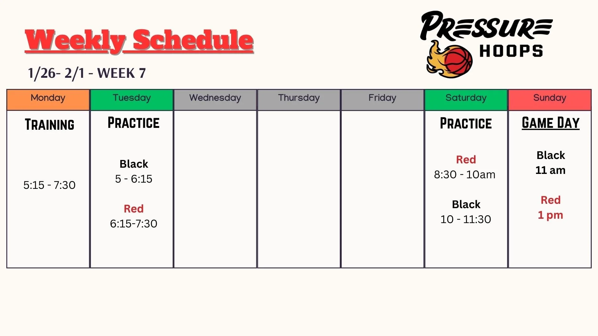 Our weekly schedule keeps players active and learning all week long with focused practices and skill drills. Whether you’re new to the game or looking to sharpen your skills, there’s something for everyone at Pressure Hoops!